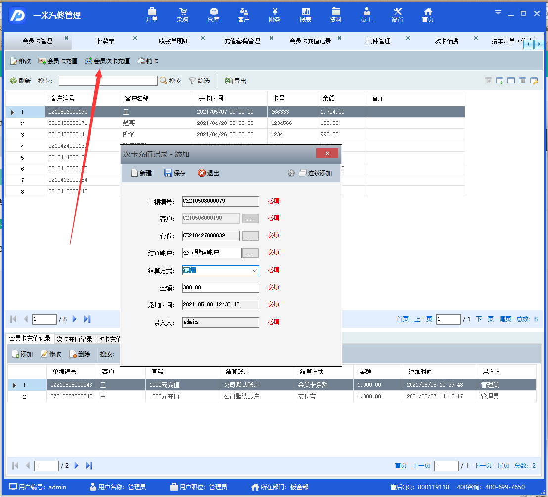 打开会员卡管理页面,选择要办理次卡套餐的会员,点击会员次卡充值,选择对应的套餐,付款的时候注意,这里不支持余额支付,必须选择其他付款方式。全部完成以后点击保存按钮,完成保存。