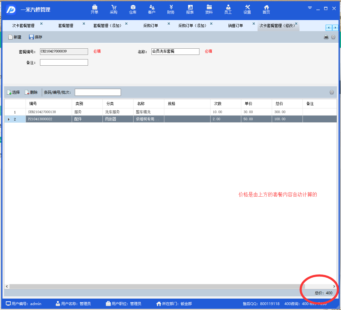 和会员卡余额充值一样,我们还是来资料模块,选择会员次卡套餐管理,点击添加按钮,添加一个套餐。在套餐中选择对应的服务项目或配件商品。这里的套餐价格是根据您选择的服务项目或者配件商品自动计算的,因此在设置价格的时候需要留意价格的构成。全部设置好以后点击保存按钮,关闭该页面。