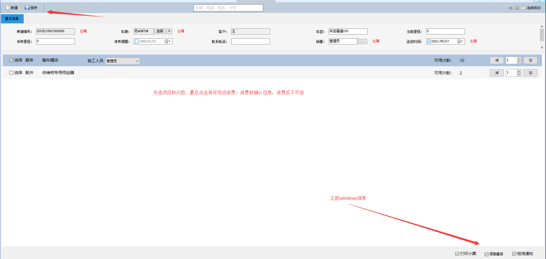 办理完成以后点击开单模块,选择次卡消费,在车牌位置选择车辆或者在白色文本框里输入卡号、车牌、手机号等信息完成对客户的搜索。选择本次消费的内容和消费的数量,点击保存即可完成消费,最下方的打印小票和短信通知可以根据情况进行勾选。语音播报功能必须要完整版(正版)windows操作系统才能使用,精简过后的windows无法使用该功能。