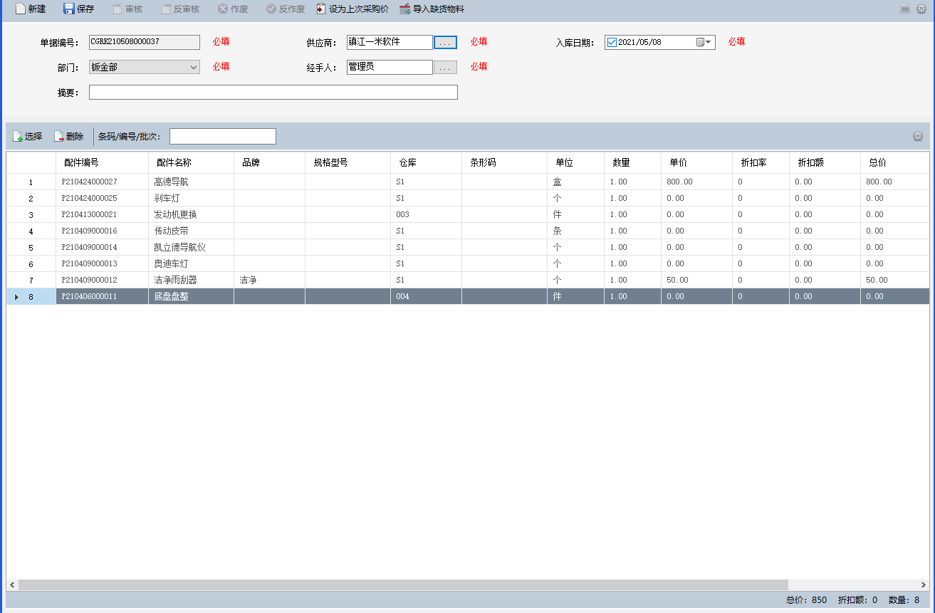 打开采购模块,选择采购订单,点击添加按钮开启一张新的采购订单。在采购单内选择一个供应商,设置采购时间,设置经办人等信息。在下方的子模块中选择本次采购的商品。菜单最上方的导入缺货物料可以一次性导入库存不足(低于安全库存)的商品。