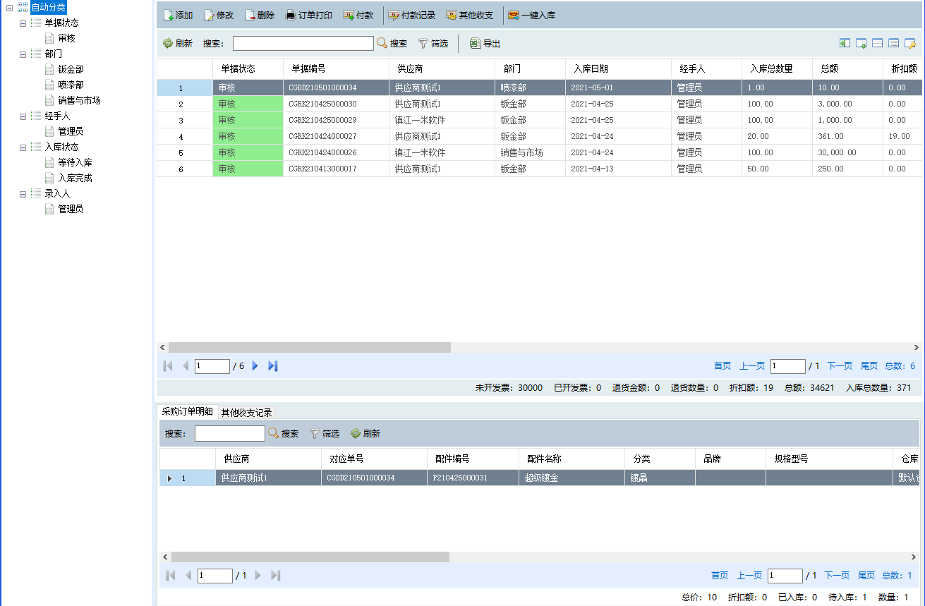 全部完成以后点击保存和审核,完成采购订单。回到订单列表页点击刷新按钮,可以对本次采购订单进行付款操作。当入库内容和本次采购内容完全一致的时候可以点击一键入库按钮,完成快速的入库(库存变化并自动生成入库单)。