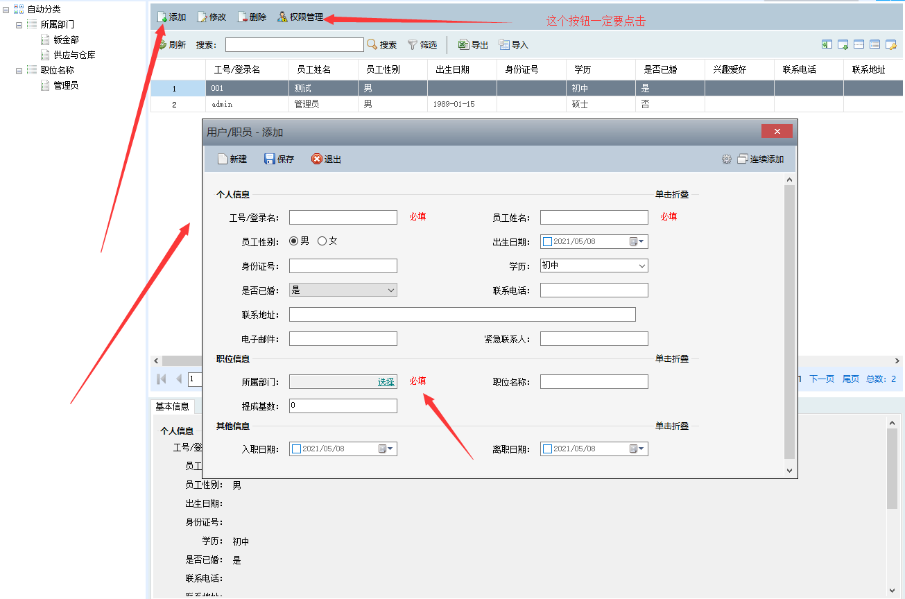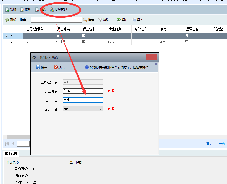 打开员工模块,选择员工和职员,点击添加按钮添加一个新的职员。依次输入他的个人信息。保存以后,点击权限管理,为用户设置密码和他的岗位(角色)。