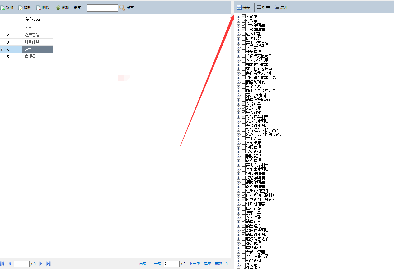 当我们需要修改一个角色的具体权限的时候,我们点击员工角色,找到需要修改的角色,在右侧进行勾选具体权限。全部勾选完成以后点击保存。子账号重新登录软件即可完成权限的更新。